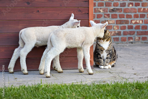 Two curious newborn lambs investigate a patient tabby cat in a farmyard. An adorable and funny scene of unlikely animal friendship, innocence, and interspecies interaction.