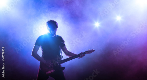 Silhouette of guitar player on stage on blue background with smoke and spotlights
