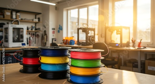 Vibrant stacks of 3D printer filament spools in a workshop bathed in sunlight