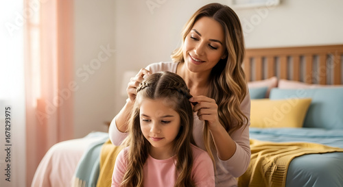 A loving mother gently braids her daughter's hair, creating a beautiful hairstyle for a special occasion, showcasing their heartwarming bond and family time.