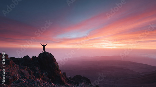 Silhouette of a person victoriously standing atop a mountain peak with arms raised against a majestic pink sunrise. Metaphor for success, achievement, and ambition.