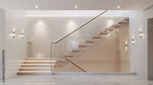 Luksusowe nowoczesne schody z podświetleniem LED i szklaną balustradą – jasne minimalistyczne wnętrze