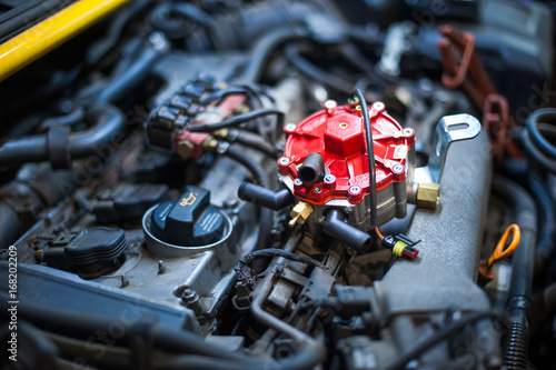 Reduktor gazu LPG przygotowany do montażu leżący na silniku. Wtryski gazu w tle.