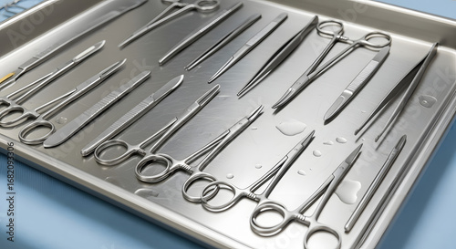 Medical Instrument Collection: A collection of shiny, meticulously arranged surgical instruments, gleaming in the clean environment. Reflecting the precision and professionalism.