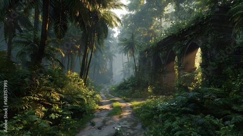 Dirt path winds through a dense, lush tropical jungle, with golden sunlight filtering through the canopy, revealing ancient, moss-covered ruins.