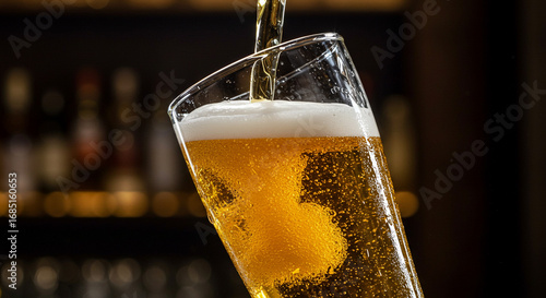 A close-up of golden beer being poured into a tilted glass, creating a frothy head in a bar setting.