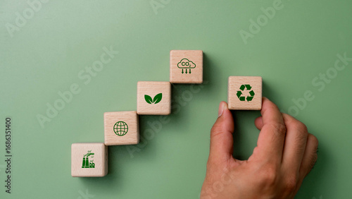 Sustainable business concept with wooden blocks featuring recycle, eco, carbon emission, solar energy, and CSR icons. Ideal for promoting environmental responsibility and green initiatives.
