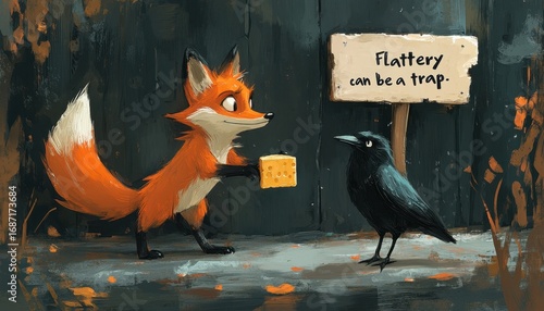 Clever Fox Tricks Raven with Cheese and a Sign Warning About Flattery in Artful Illustration