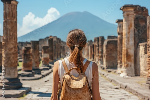 Woman visiting the historic ruins of Pompeii, learning about the ancient civilization