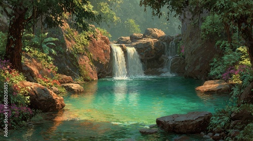 Tropical rainforest waterfall with rainbow, lush green foliage and misty atmosphere