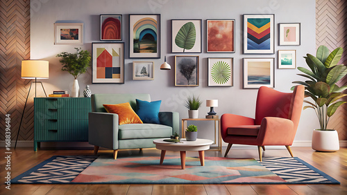Modern eclectic living room mockup with gallery wall frames for interior design presentation