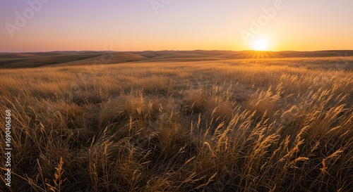 Breathtaking sunset casting a warm, golden glow over a vast, rolling prairie field of dry grass