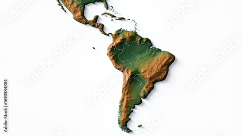 3D Textured Map of the Americas A highly detailed, three-dimensional rendering of North, Central, and South America on a clean white background. This image highlights the varied topography and relief