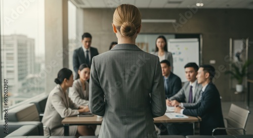 Businesswoman leads a meeting with diverse colleagues in a modern office setting.