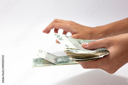Polskie pieniądze, banknoty w kobiecych dłoniach na białym tle