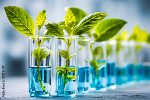 Plants growing in orderly rows of glass test tubes highlight progressive botanical science and environmentally conscious farming technology.