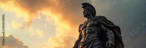 A powerful bronze statue of a Greek hero, sculpted with intricate detail, stands proudly against a dramatic sky The image evokes strength, mythology, and ancient Greece , epic, mythological, legend
