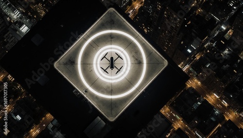 An aerial top-down view of a drone on an illuminated rooftop landing zone at night.