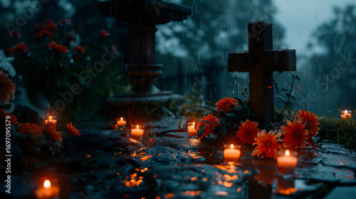 Cmentarz w deszczu, zapalone świeczki, kwiaty i krzyż – Dzień Zaduszny, pamięć o zmarłych, nostalgia