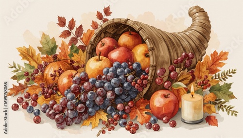 Watercolor illustration of a cornucopia with autumn fruits and vegetables