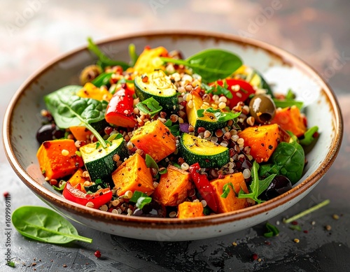 Sałatka z pieczonych warzyw z kaszą gryczaną, batatem, cukinią, papryką i szpinakiem