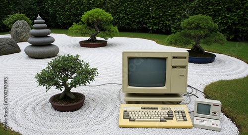 Computer vintage in bella mostra su un terriccio di sassi e bonsai attorno in una visione artistica di insieme