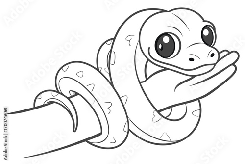 Adorable Cartoon Snake Curled Around a Human Hand Drawn with Simple Lines in a Black and White Illustration