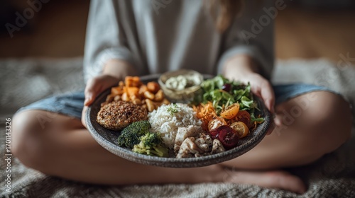 Woman sits cross-legged, holding a plate of healthy food. It portrays wellness, conscious eating, and a balanced lifestyle.