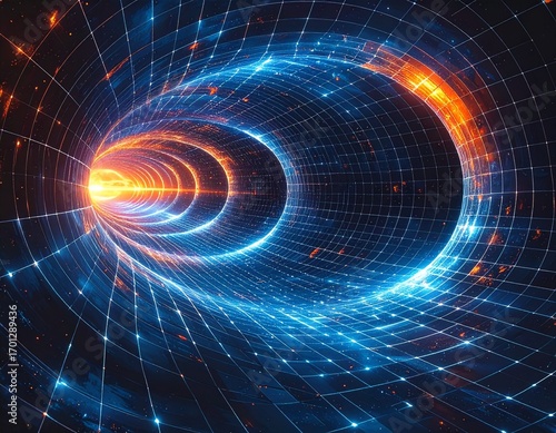 Journey through a futuristic digital spacetime continuum tunnel with a glowing blue and orange energy grid
