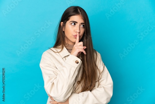 Young caucasian woman isolated on blue background showing a sign of silence gesture putting finger in mouth