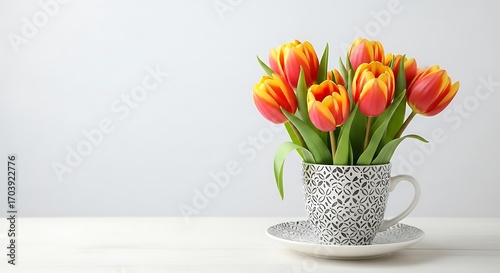Vibrant tulips in a patterned teacup, a delicate arrangement against a neutral backdrop.