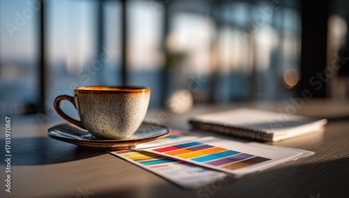 A cup of coffee on a table, alongside color swatches and a notepad. Sunlight filters through a window