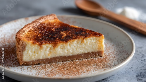 South African milk tart with cinnamon dust, modern backdrop with central text space