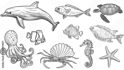 Kolorowanki dla dzieci – Zwierzęta morskie: delfin, żółw, rekin, krab, meduza i inne stworzenia oceanu do druku