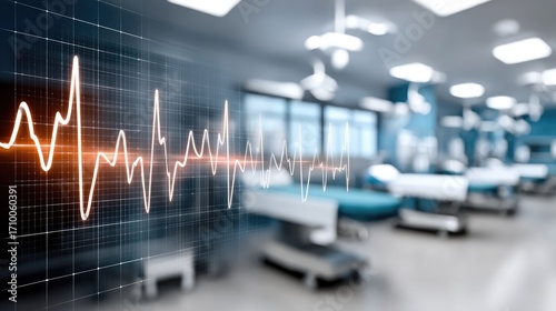 Heartbeat monitor lines display vital signs in a modern hospital room during a routine check on patients in recovery beds