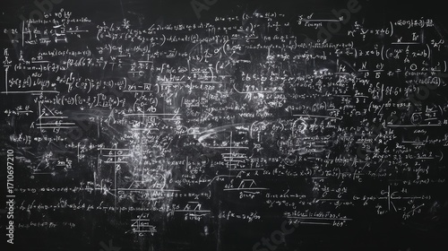 Complex mathematical equations on blackboard with chalk writings