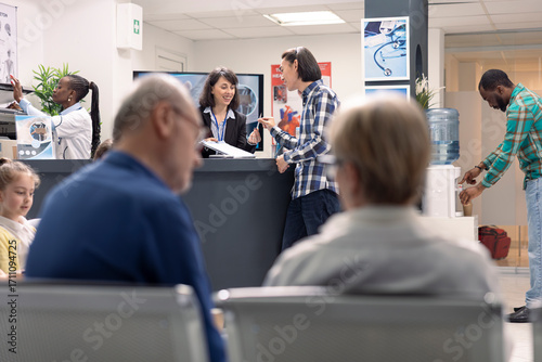 Receptionist at front desk supports patient intake by updating health records and scheduling treatment visits in busy clinic. Hospital staff discussing upcoming medical checkups with asian man.
