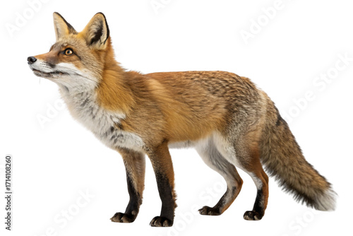 Red fox in alert standing position showing russet coat with white chest and black legs, isolated on a transparent background
