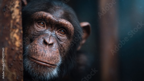 A close-up of a chimpanzee gazes thoughtfully into the distance, displaying deep, intelligent eyes and a serene expression, inviting contemplation of nature's wonders.