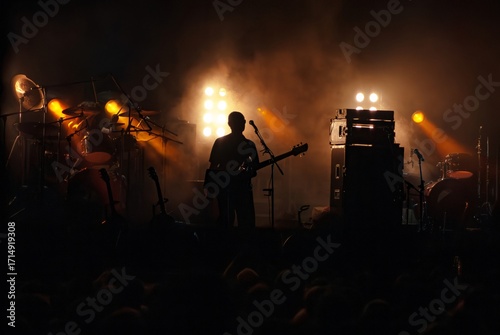 Dynamic image of a rock band performing on stage, silhouetted against vibrant lights and smoky atmosphere, capturing the essence of energy, music passion, and live concert excitement.