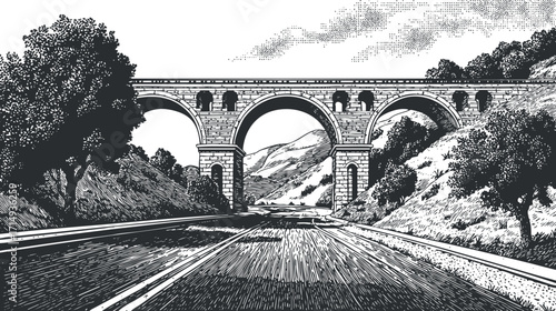 An artistic black and white illustration of a viaduct bridge over a countryside road.