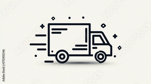 A minimalist line art illustration of a delivery truck speeding, indicated by motion lines and sparkles, cast a subtle shadow on a light grey background