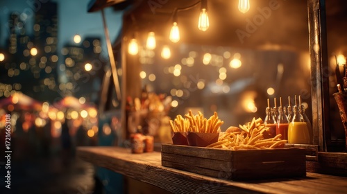 Street Food Stand with French Fries, Glowing Lights and Festive Vibes in Background, Delicious Snack at Night Market, Warm Urban Atmosphere with City Lights and Outdoor Food Stall