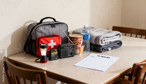 72-hour survival kit displayed on dining table with backpack, flashlight, canned food, bottled water, radio, blankets and checklist. Symbol of resilience, crisis preparedness, and family safety.
