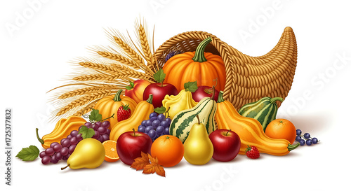 Abundant cornucopia overflowing with autumn harvest fruits vegetables and grains