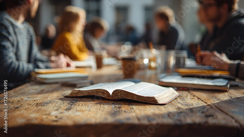 A group of friends actively discusses their thoughts and insights while surrounded by open Bibles and notebooks on a wooden table during a study session