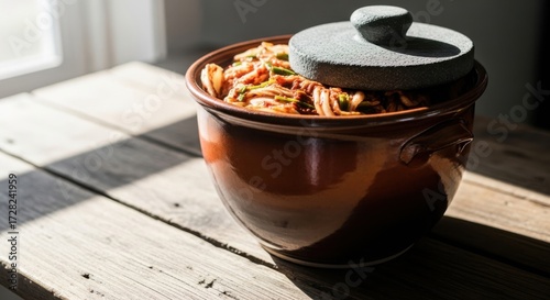 Traditional earthenware pot with kimchi, showcasing sustainable food preservation, eco-friendly culinary traditions, and a cozy atmosphere in an environmentally conscious setting.