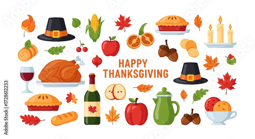Colorful illustration of Thanksgiving dinner elements: turkey, pie, apples, corn, wine, and autumn leaves, conveying a festive and celebratory mood, ideal for holiday greetings