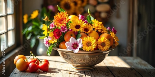 Sunlight illuminates vibrant fruit & flowers in a vintage ceramic bowl, rustic wooden table, royalty free, image