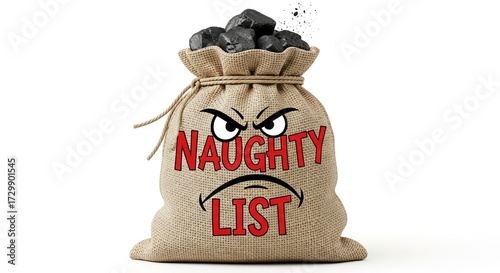 A burlap sack filled with lumps of coal, labeled with the words naughty list and featuring an angry face, isolated on white background